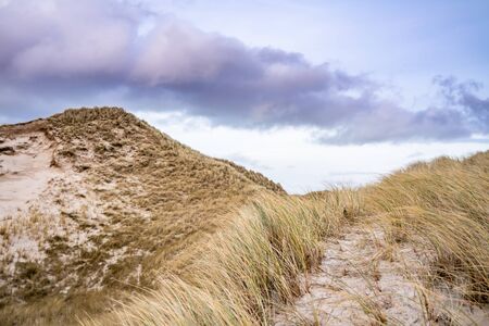 Sand dunes on the island of Amrum in spring on a cloudy, atmospheric day at low tide. Idyllic picturesque landscape with dry grass.
