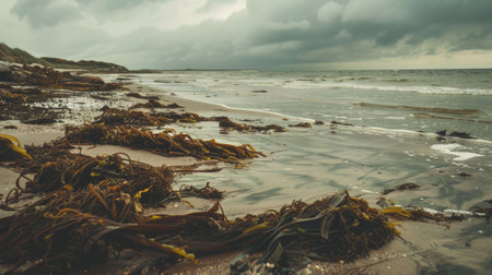 The beach appears desolate, covered with debris washed ashore by strong winds, while gentle waves lap at the sand under a cloudy sky as day transitions to night.