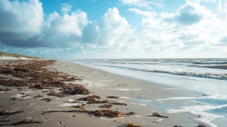 A natural landscape with a beach covered in driftwood, under a cloudy sky with cumulus clouds. The horizon is visible over the water, with trees scattered along the shore AIG50