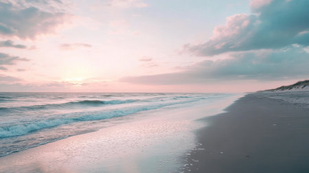 In early spring, the beach stands empty under a soft pastel sky. The waves gently kiss the shore, reflecting the serene colors of dawn as the day begins.