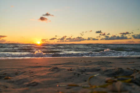Baltic sea shore at sunset. Soft golden sunlight, glowing sky, waves. Idyllic seascape. Travel destinations, eco tourism, nature, weather, climate change. Picturesque panoramic scenery