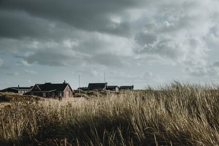 Wooden colorful weekend houses on the Rømø island in Denmark under the cloudy sky with the marram grass in the foreground during the autumn day