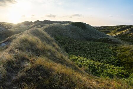 Sylt island landscape with dunes covered in marram grass, moss and rose bushes at sunrise. German nature reserve in summer.