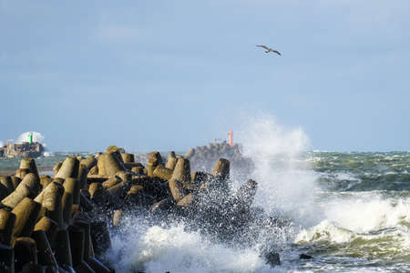 during stormy weather in the Baltic Sea, large waves crash against concrete blocks of a breakwater