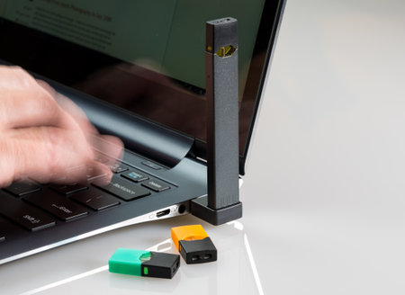 MOSCOW - 26 June 2020: Juul e-cigarette nicotine vapor stick and laptop