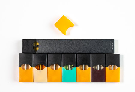 MORGANTOWN, WV - 25 AUGUST 2018: Juul e-cigarette or nicotine vapor containers known as JUULpods on white background
