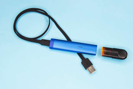 MOSCOW - 26 June 2020: Juul e-cigarette nicotine vapor stick and laptop with usb charger.