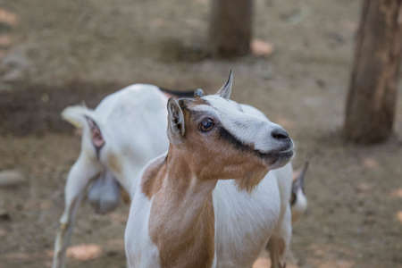 Cute little white goat looks at camera. Funny pets.