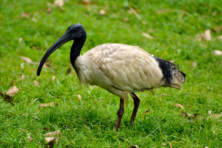 Australian white ibis (Threskiornis molucca) a large bird with a black head and white plumage, the animal walks on the green grass in the park on a sunny day.