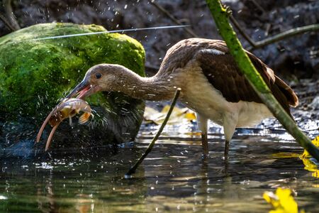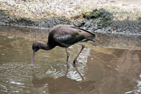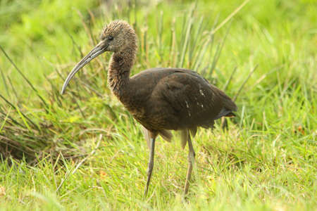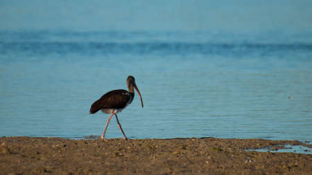 The Plegadis falcinellus bird. (Threskiornithidae). Glossy Ibis in wildlife. Unusual african wading bird.