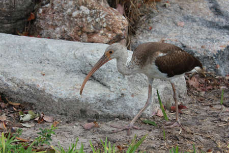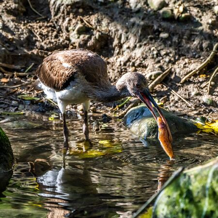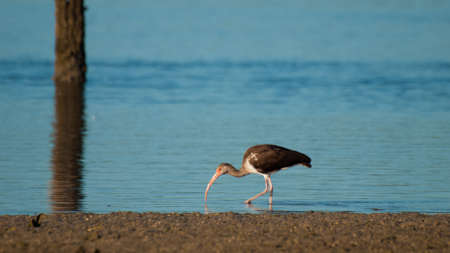 Young brown White Ibis, Eudocimus albus, white bird with red bill in the water.