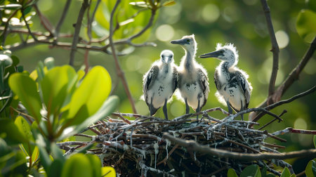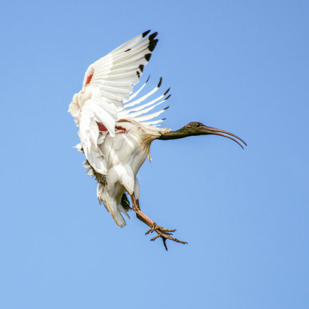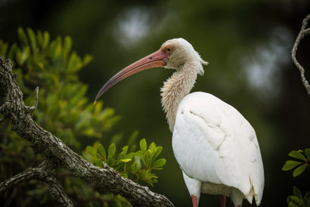 A profile of a young white ibis sitting on top of a tree on Pinckney Island in Hilton Head, South Carolina. Background is green. Generative AI