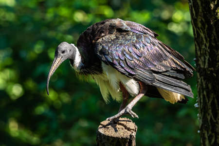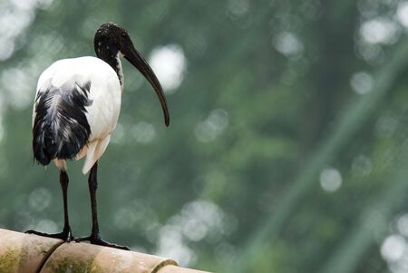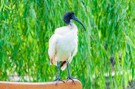 Sacred ibis bird sitting on the bench against green leaves on the background