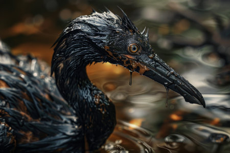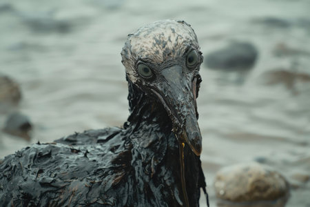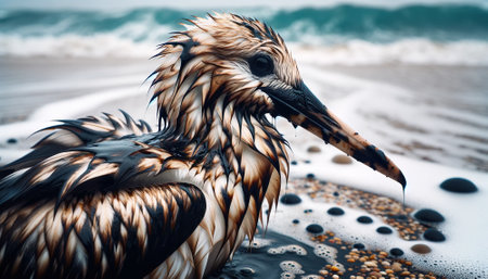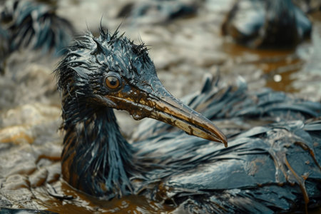 close-up of a bird covered in oil. The bird is struggling to fly, and there are other birds in the background
