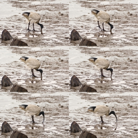 Sequence of six frames of Australian white ibis digging deep his bill in sand on swamp lifting one leg and reverse