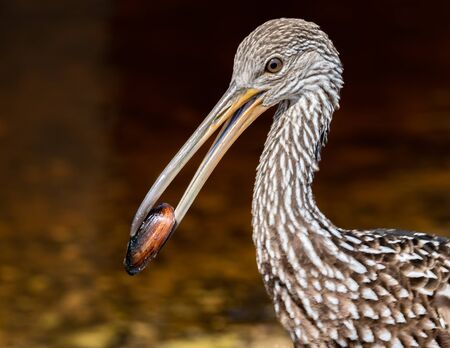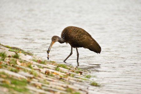 Limpkin bird Aramus guarauna forages for mollusks in the lake at Myakka State Park in Sarasota, Florida