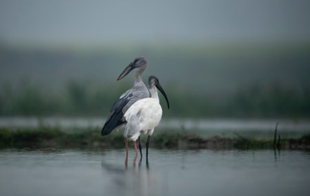 Asian woolly-necked stork or Asian whitenecked stork bird pair on a dead tree perch with beautiful isolated background at ranthambore tiger reserve, india