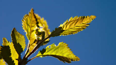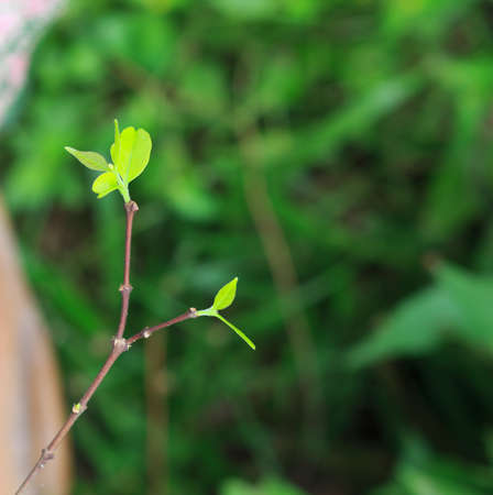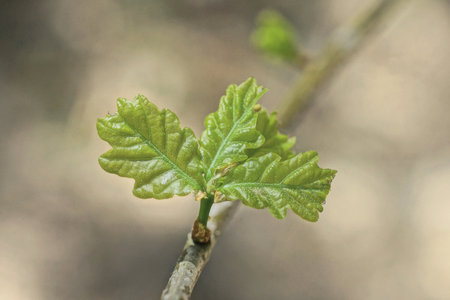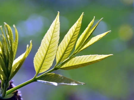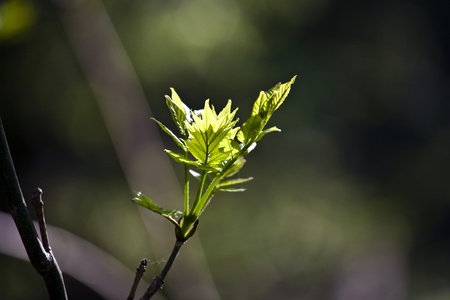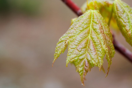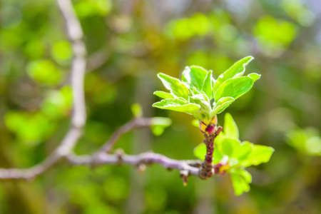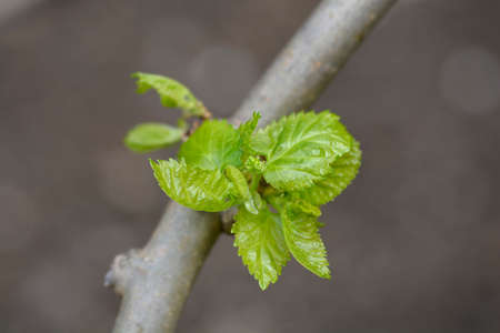 Closeup view on a tree branch with fresh blooming foliage. Blurred background