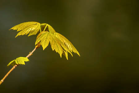 Chestnut tree leaves bloom in spring. Birth and ecological concept. Close-up of the leaf. Blured background. Beautiful nature and one branch. Amazing texture and structure.