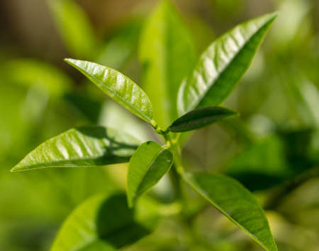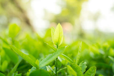 Closeup, Top of Green tea leaf in the morning, tea plantation, blurred background. A leaf of Chinese camellia, from which green and black tea are made
