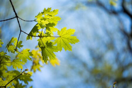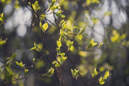 Birch twig with young foliage on blurred trees and blue sky background at springtime. Coloring and processing photo. Toned. Shallow depth of field.