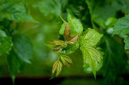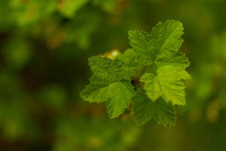Red Currant fresh leaves on greenery background with copy space. Ribes rubrum.