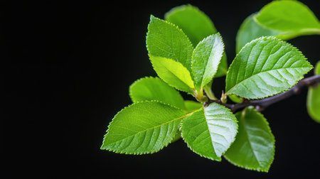 Dramatic lighting on fresh green leaves with sharp contrast against a black background