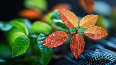 Nature meets technology: vivid leaves contrasting with dark digital circuit patterns