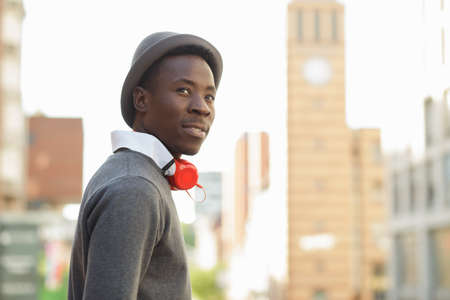 Portrait of african american man with hat and headphones in city street