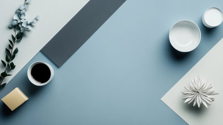 A minimalistic workspace displays a cup of coffee, bowls, and decorative items on a soft blue surface complemented by greenery.