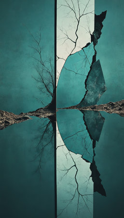 Surreal landscape with cracked mirror and tree reflection in calm water.