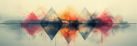 A serene landscape features a lake reflecting mountains and a vibrant sky at sunset. The composition includes a geometric prism element, adding a modern touch. Soft colors create a calming atmosphere, with reflections enhancing the symmetrical layout. Suitable for various commercial and editorial applications.