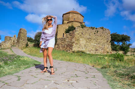 Happy young traveling woman blonde tourist outdoors in ancient Europe fortress ruins. Beautiful female on summer holiday vacation, active lifestyle concept. Jvari Monastery, Mtskheta, Georgia