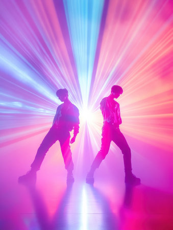 Two K pop idols strike dynamic poses on stage, surrounded by mesmerizing pastel lighting that enhances their performance energy.