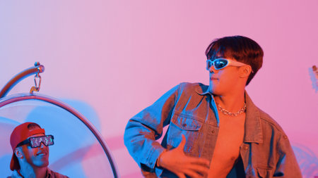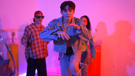 Multicultural friend dancing together and moving along hiphop music while standing at restaurant or cafe with pink neon light. Professional street dancer group perform energetic movement. Regalement.