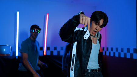 Attractive asian street dancer perform freestyle movement with neon light. Professional performer practicing moving to hip hop music with diverse friends or team at studio with led light. Regalement.