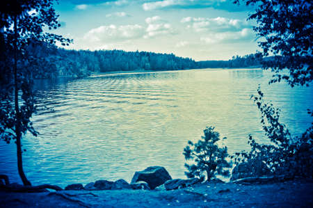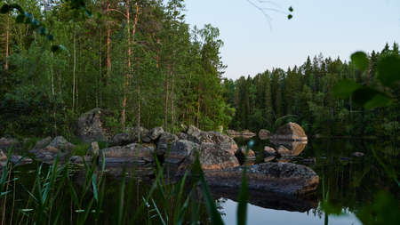 typical Finnish landscape - a lake in a pine forest with huge boulders brought here during the Ice Age. Evening, dim light, strongly diffused lighting, selective focus.