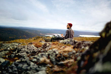 Hiker wearing a jacket and carrying a backpack walks along the beach and watches Lake Jatkonjarvi at sunset in Koli National Park, eastern Finland. Man aged 24 wearing sports clothes. Active lifestyle.