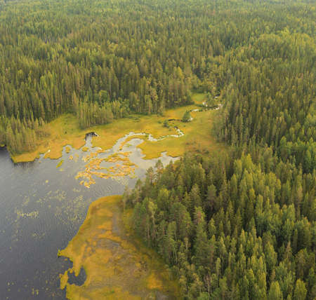 Dense forest, taiga with a small swampy river flowing into the lake. Top view from a quadcopter
