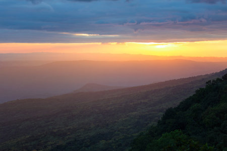 Sunset at Loei Province, Phu Kradueng National Park Thailand. Landscape view from mountain.