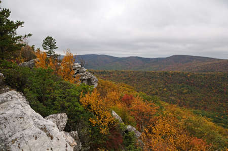 The Minister Creek Trail overlook in Allegheny National Park. In the distance can be seen the hills, mountains, valleys, and forests of the park. In the foreground is a large stone boulder.