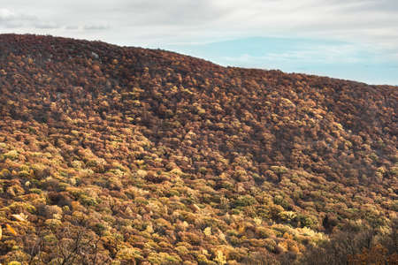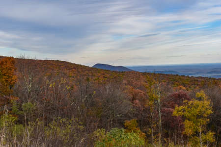 Shenandoah National Park, Virginia, USA - November 3, 2021: Mountain Scenery With Beautiful Fall Trees in the Foreground and a Bright Blue Sky in the Background