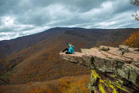 A joyful individual sits on a rocky cliff, capturing a selfie against a backdrop of vibrant autumn trees and distant mountains. The sky is cloudy, adding drama to the scene.