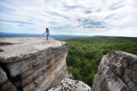 A girl on the background of the landscape of the Caucasus Mountains - The Eagle Rocks Mountain shelf, Mezmai