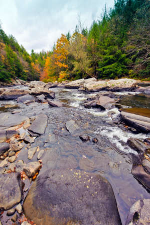 Autumn landscape with a river and rocks in the forest. Colorful foliage in the forest.