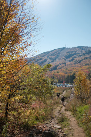 Autumn mountain landscape with colorful forest and road on a sunny day. Trail in Stoneham Mountain, Quebec, Canada.
