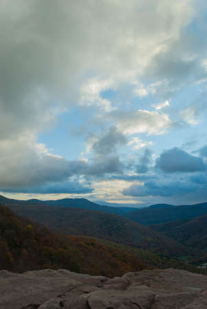 Mountainous landscape with a cloudy sunset sky with stormy weather, the mountains are wooded with greenish and orange colors.