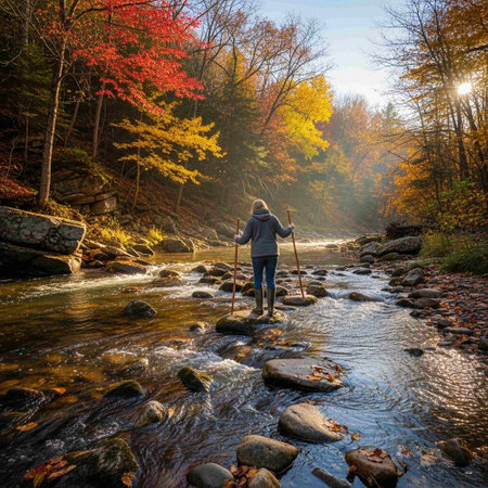 River flows through vibrant autumn forest, water reflecting colorful foliage
