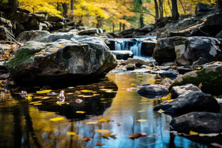 Tranquil scene of autumn forest, vibrant colors, flowing water, mountain range generated by artificial intelligence