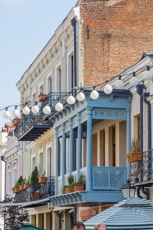 Georgia, Tbilisi - March 19, 2021: Houses with balconies in the historic district of Tbilisi. Georgia. Evening View. Beautiful Old town at sunset.